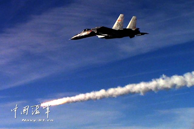 ↑資料照片:殲-15艦載戰(zhàn)斗機發(fā)射導彈。