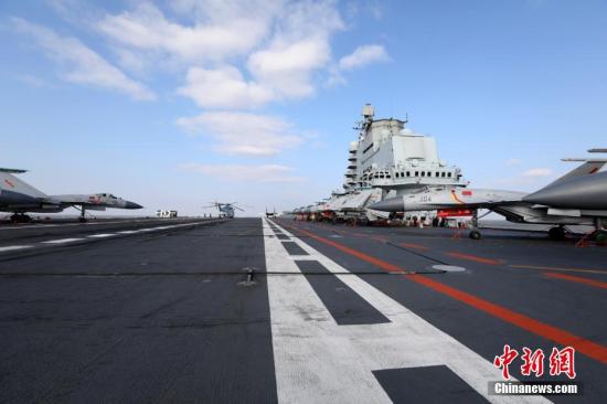 資料圖:2016年12月23日,在黃海某海空域,多批次殲-15艦載戰(zhàn)斗機(jī)從遼寧艦飛行甲板起飛升空,開展了空中加受油、空中對(duì)抗等多項(xiàng)訓(xùn)練任務(wù)。 中新社發(fā) 莫小亮 攝