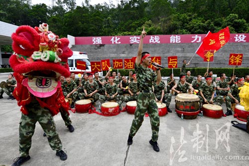 ????“一個人要喊出一個團(tuán)的聲音,一個連要有一個軍的殺氣!”反恐大隊拉拉隊隊長、四級警士長王偉健將拉拉隊員的“終極目標(biāo)”概括為:“氣吞萬里如虎!”。盤點(diǎn)拉拉隊,發(fā)現(xiàn)的是當(dāng)代革命軍人朝氣蓬勃的無限生機(jī)。你以為拉拉隊就只是扯開脖子死命喊嗎?那都是上個世紀(jì)的事了。在現(xiàn)場,可以看到大喇叭喊話筒、橫幅標(biāo)語舉大牌、敲鑼打鼓吹軍號,甚至連舞獅、軍樂演奏都來用上了,而且通常是比賽未起、戰(zhàn)鼓先擂,隊員有休息、拉拉隊無所息,場上激情90分鐘、場下比拼5400秒,各種打氣喝彩的詞更是層出不窮、推陳出新,一支隊伍的精氣神可見一斑。(廖鍵)