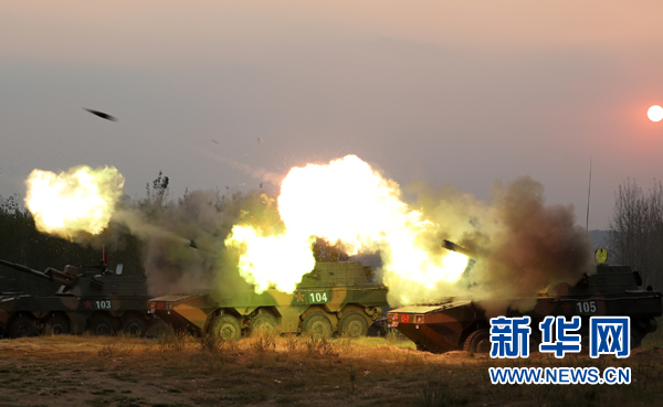 在“中部礪劍-2016·確山C”演習跨晝夜實彈演練中,參演的葉挺獨立團官兵進行某型榴彈炮實彈射擊(2016年9月21日攝)。新華社發(fā)(申冬冬 攝)