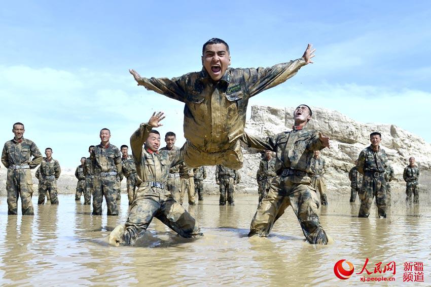 特戰(zhàn)隊(duì)員進(jìn)行泥潭格斗訓(xùn)練。