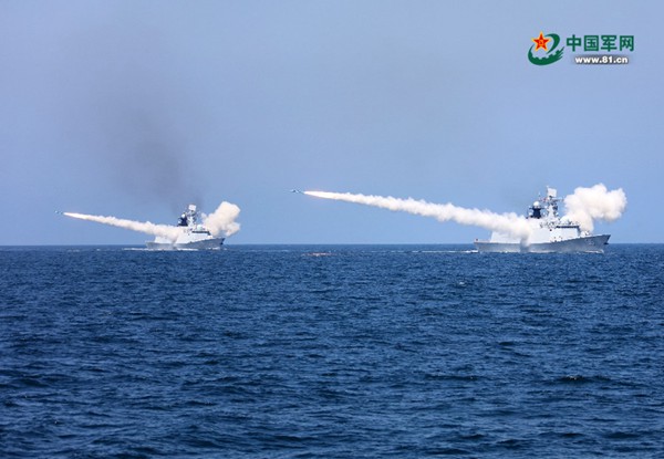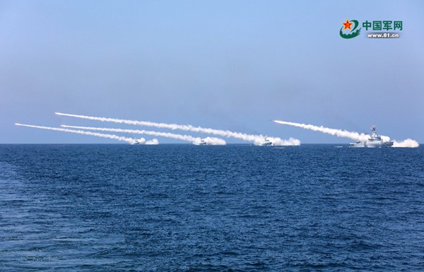 8月7日,海軍在黃海、渤海相關(guān)??沼蚪M織實(shí)兵實(shí)彈對(duì)抗演習(xí),最大限度檢驗(yàn)體系作戰(zhàn)能力、戰(zhàn)法訓(xùn)法、武器裝備效能,共實(shí)射各型導(dǎo)彈數(shù)十枚。這是水面艦艇齊射反艦導(dǎo)彈。李唐 攝(圖片來源:中國(guó)軍網(wǎng))