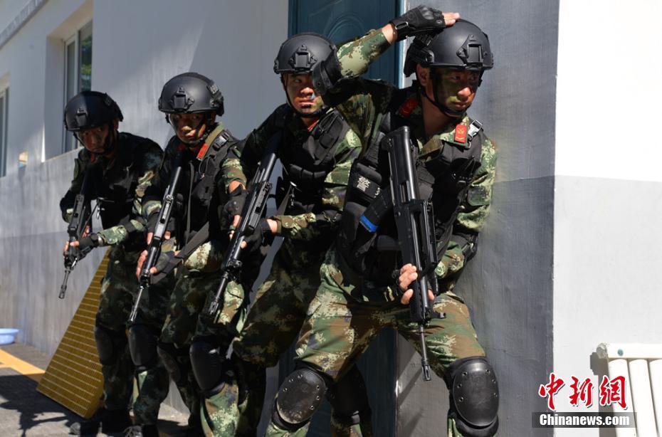 ????8月9日,擔(dān)負中哈出入境邊防檢查任務(wù)的新疆邊防總隊巴克圖邊檢站,緊貼安保任務(wù)需要,從實戰(zhàn)出發(fā),在烈日下加大對單個軍人應(yīng)急作戰(zhàn)和小組配合作戰(zhàn)的培訓(xùn),以提高官兵在執(zhí)行急、難、險、重任務(wù)時的綜合能力。王躍 攝