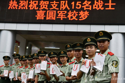 ????昔日禁毒反恐當(dāng)尖兵,今朝題名金榜站排頭!正當(dāng)各地紛紛樂道高考升學(xué)率的同時(shí),南粵邊防警營也傳來喜報(bào)。8月28日,深圳銀湖山訓(xùn)練基地里處處洋溢著喜悅;禁毒尖兵、狙擊手、士官楊平申等來至廣東公安邊防總隊(duì)機(jī)動(dòng)支隊(duì)的15名戰(zhàn)士喜圓軍校夢(mèng),被廊坊武警學(xué)院、公安邊防高等??茖W(xué)校等3所部隊(duì)院校錄取,戰(zhàn)友們?yōu)樗麄兣e行簡樸而隆重的歡送儀式。據(jù)悉,連續(xù)多年來,這個(gè)支隊(duì)在廣東邊防總隊(duì)40多個(gè)基層單位中戰(zhàn)士升學(xué)率名列前茅。