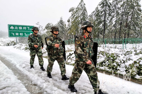 圖為北極邊防派出所官兵冒雪巡邏,防止外來(lái)游客及轄區(qū)群眾發(fā)生險(xiǎn)情