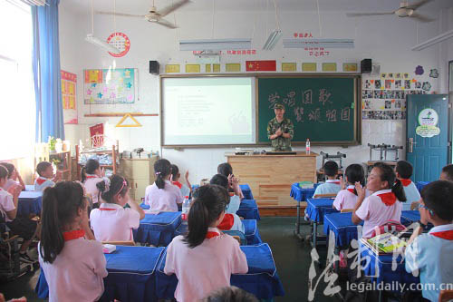 ????“起來,不愿做奴隸的人們,把我們的血肉鑄成我們新的長城……”一進(jìn)門就聽到爵溪小學(xué)四年級三班響起了嘹亮的國歌聲,小朋友們正在爵溪邊防官兵的帶領(lǐng)下學(xué)唱國歌。