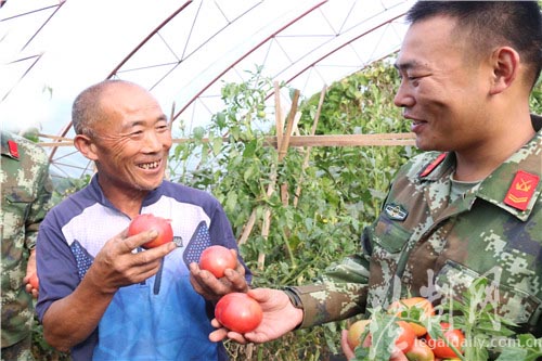 圖為當?shù)剞r民稱贊官兵自己種植的西紅柿