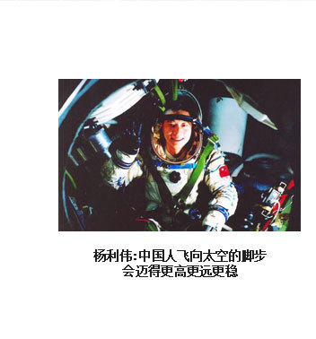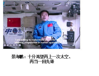 ??? 為了人類(lèi)的和平與進(jìn)步,中國(guó)人來(lái)到了太空。2003年10月15日,我搭乘神舟五號(hào)飛船,在太空飛行14圈,歷時(shí)21小時(shí)23分,完成了中國(guó)首次載人航天飛行。雖然是獨(dú)自在太空飛行,但一想到億萬(wàn)祖國(guó)人民翹首以待,我覺(jué)得不是一個(gè)人在飛。于是我拿起太空筆,在工作日志的背面寫(xiě)上了這樣一句話(huà):“為了人類(lèi)的和平與進(jìn)步,中國(guó)人來(lái)到了太空”,并在艙內(nèi)鏡頭前向祖國(guó)人民、世界人民展示?!盀榱巳祟?lèi)的和平與進(jìn)步”,是中國(guó)發(fā)展載人航天事業(yè)的初衷,“中國(guó)人來(lái)到了太空”既描述了一個(gè)歷史時(shí)刻,也表達(dá)了我為祖國(guó)航天事業(yè)感到無(wú)比自豪的心情。?