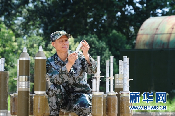 中國工程院院士、軍事科學院國防工程研究院研究員任輝啟檢查彈體作用情況(資料照片)。 新華社發(fā)(侯藝兵 攝)