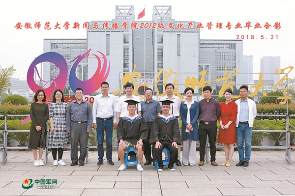5月21日,安徽師范大學(xué)新聞與傳播學(xué)院組織應(yīng)屆畢業(yè)生拍攝畢業(yè)照,眾多班級的學(xué)生依次排隊拍攝,其中一個班級與眾不同——只有兩名學(xué)生,而與他倆合影的卻有11名老師。并且,11名老師站在后排,兩名學(xué)生坐在前排。當(dāng)相機的快門摁下之后,這張照片成為該校濃厚尊崇軍人氛圍的亮麗名片。
