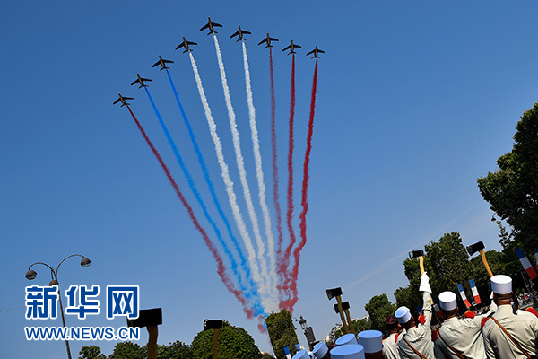 7月14日,在法國(guó)巴黎舉行的國(guó)慶閱兵儀式上,“法蘭西巡邏兵”飛行表演隊(duì)飛過香榭麗舍大街。新華社記者 陳益宸 攝