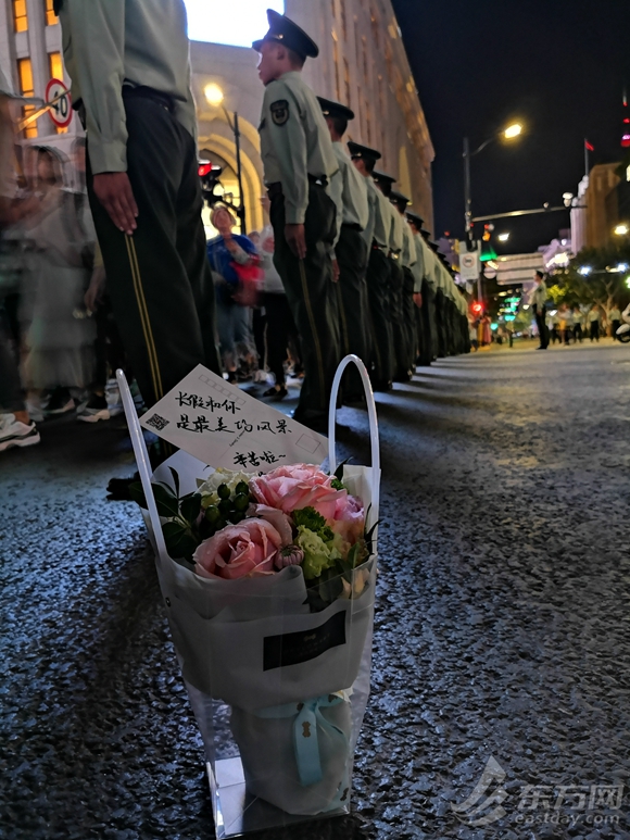 10月4日晚21時10分,在南京路步行街十字路口,一位姑娘手捧鮮花走執(zhí)勤官兵面前:“辛苦你們,這束花送給你們!”放下轉(zhuǎn)身便消失在人群之中。當執(zhí)勤官兵拿起鮮花時驚喜地發(fā)現(xiàn),里面還夾了一張?zhí)刂频拿餍牌晷愕淖舟E寫到:“長假和你,是最美麗的風景。辛苦啦~比心~”