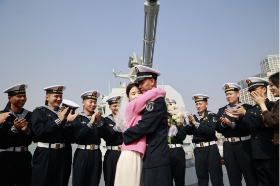 12月21日,海军红河舰圆满完成第47批护航编队任务,返抵母港。军港码头上,数百名官兵家属翘首以盼,除了载誉而归的喜悦和久别重逢的热泪,一场“迟到”的婚礼,让凛冽的冬日军港再次漾起温暖的涟漪。