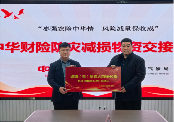 中华财险枣强支公司与枣强县气象局进行防灾减损物资交接。