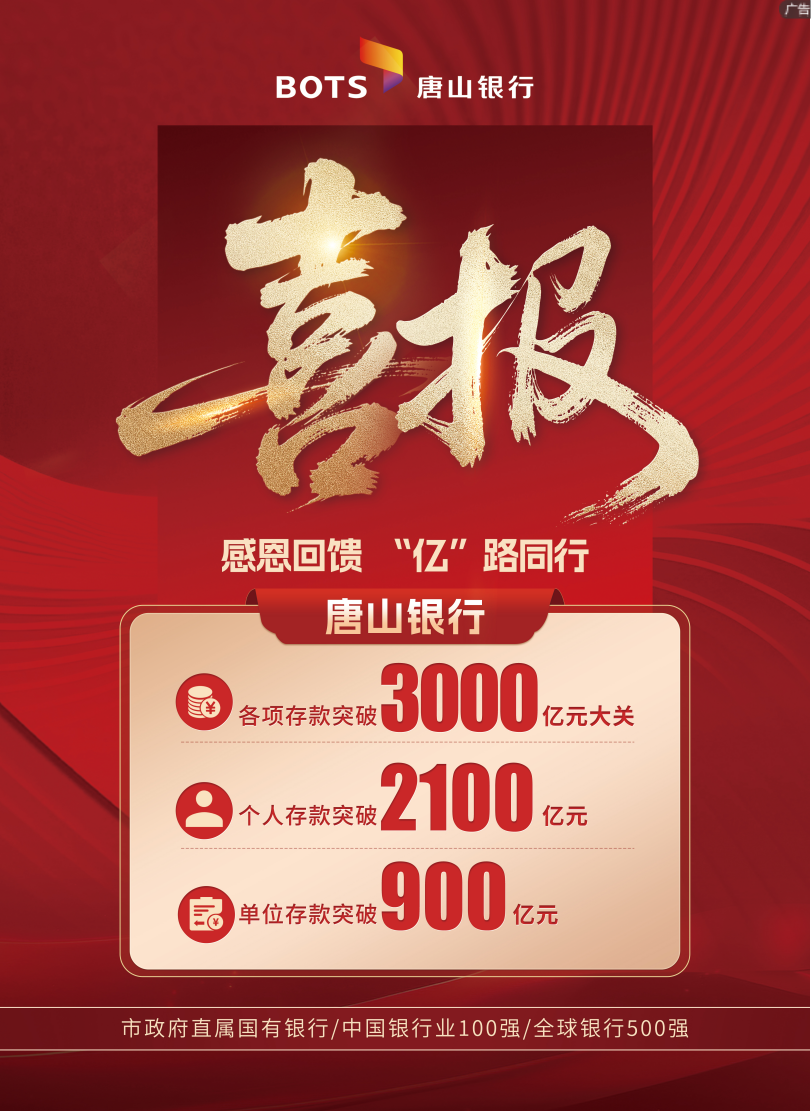 12月24日,唐山银行存款总额在唐山市率先突破3000亿元大关,达到3009亿元,较年初增长263亿元,同时个人存款突破2100亿元,单位存款突破900亿元,存款规模实现“三个历史性突破”。