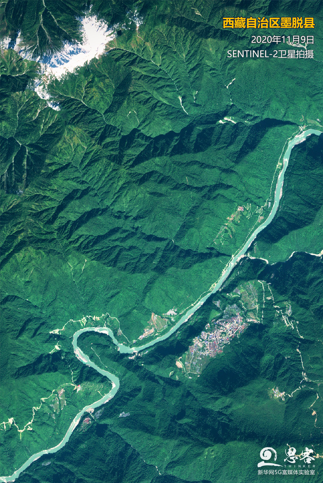 ▲鑲嵌在雅魯藏布江峽谷深處的“秘境”墨脫。衛(wèi)星數(shù)據(jù)來源:SENTINEL-2