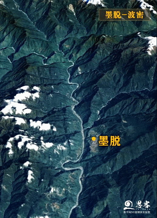 ▲從墨脫至波密縣扎木鎮(zhèn)衛(wèi)星三維實景。衛(wèi)星數(shù)據(jù)來源:高分六號