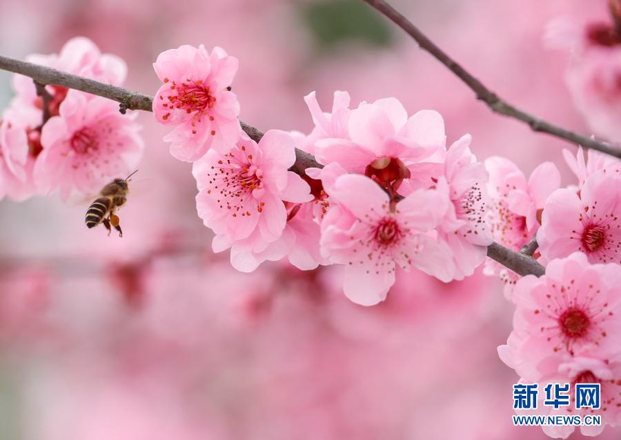在浙江景寧畬族自治縣,蜜蜂在盛開(kāi)的梅花旁飛舞(2月14日攝)。新華社發(fā)(李肅人 攝)