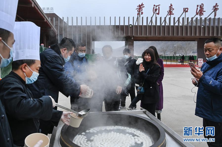 2月24日,陜西壺口瀑布景區(qū)工作人員(前左)為游客送上免費(fèi)的湯圓。