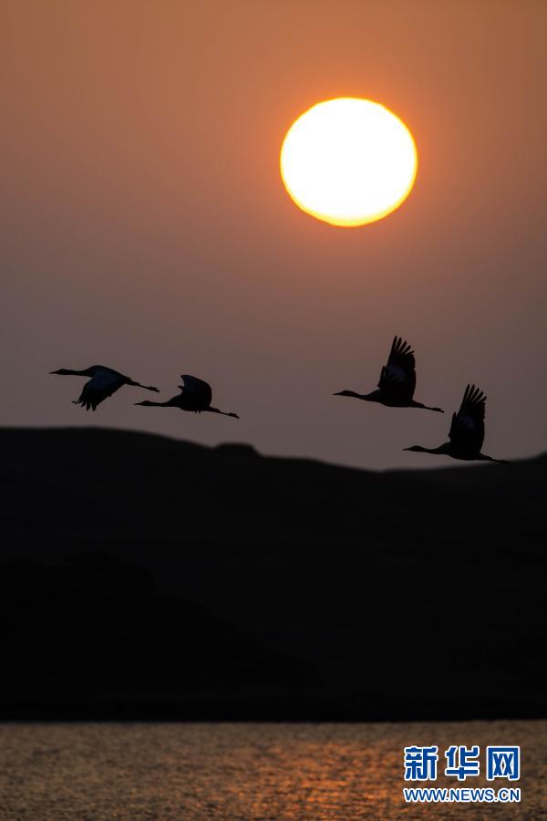 日出時(shí)分,黑頸鶴在大山包黑頸鶴國(guó)家級(jí)自然保護(hù)區(qū)飛翔(2月27日攝)。新華社記者 胡超 攝