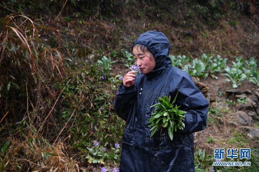 張志菊在田里勞作結(jié)束后摘了一朵野花(2月26日攝)。