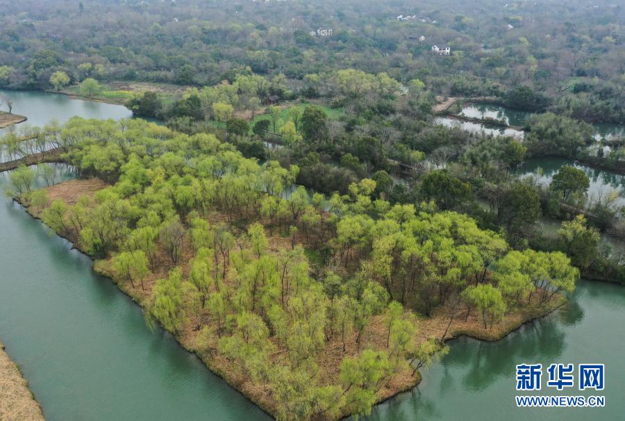 西溪濕地內(nèi)植被吐出新綠(3月2日攝,無人機(jī)照片)。