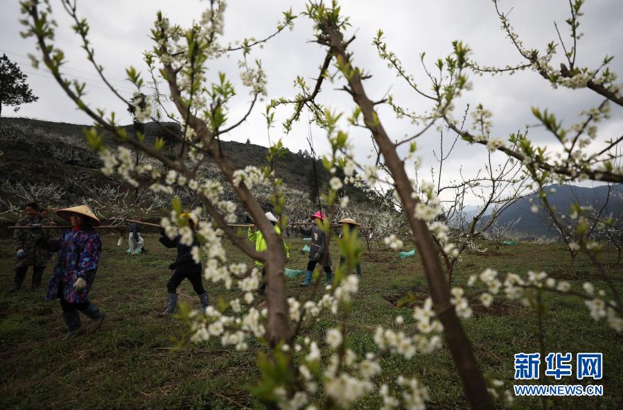 3月2日,村民在貴州省銅仁市江口縣閔孝鎮(zhèn)提紅村過江屯翠紅李種植基地進行春管作業(yè)。新華社發(fā)(李鶴 攝)