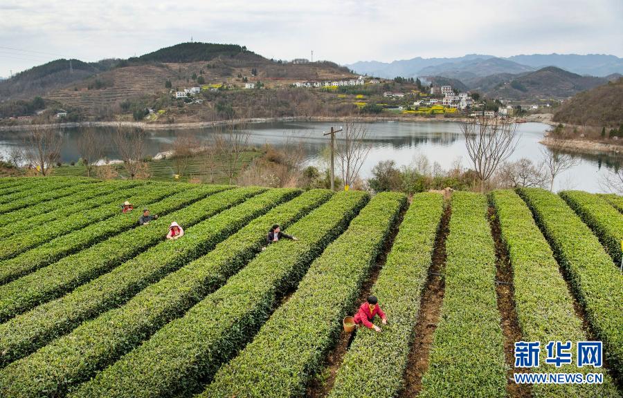 3月4日,茶農在安康市漢濱區(qū)流水鎮(zhèn)剛子茶葉專業(yè)合作社標準化茶園采摘新茶(無人機照片)。新華社記者 陶明 攝