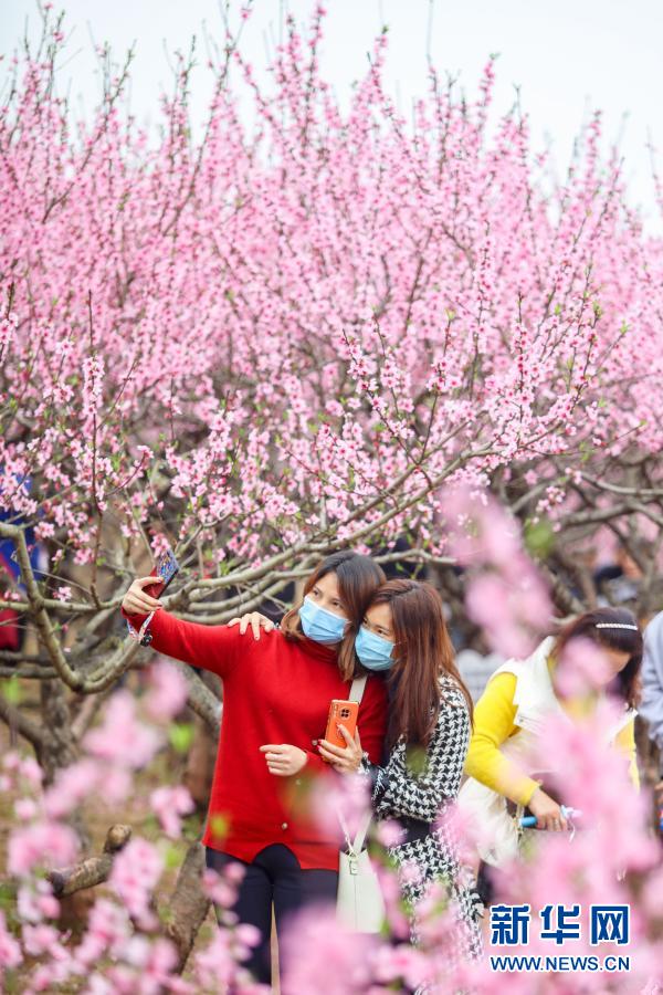 3月8日,四川省遂寧市大英縣卓筒井鎮(zhèn)為干屏村桃花盛開,踏青賞花的游客在花前自拍。