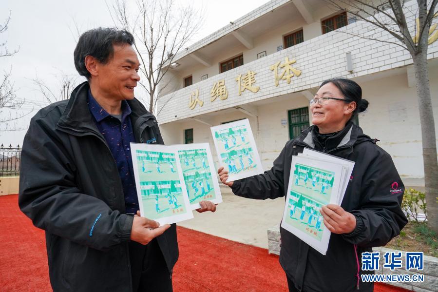 騎路小學劉彥老師(右)和校長劉恩展示以學生命名的花樣跳法卡片(3月9日攝)。新華社記者 李博 攝