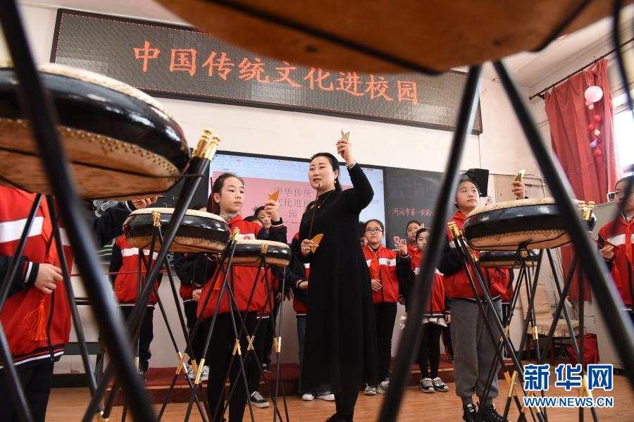 3月17日,西河大鼓藝人在河間市第一實驗小學指導(dǎo)學生練習西河大鼓。