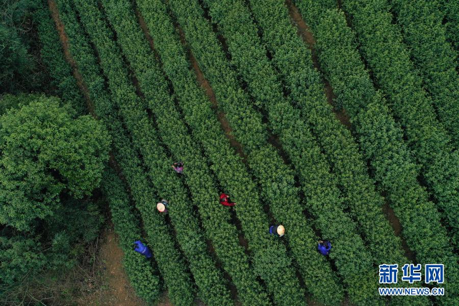 3月20日,采茶工在余杭區(qū)余杭街道竹園村的茶園采摘茶葉(無人機(jī)照片)。