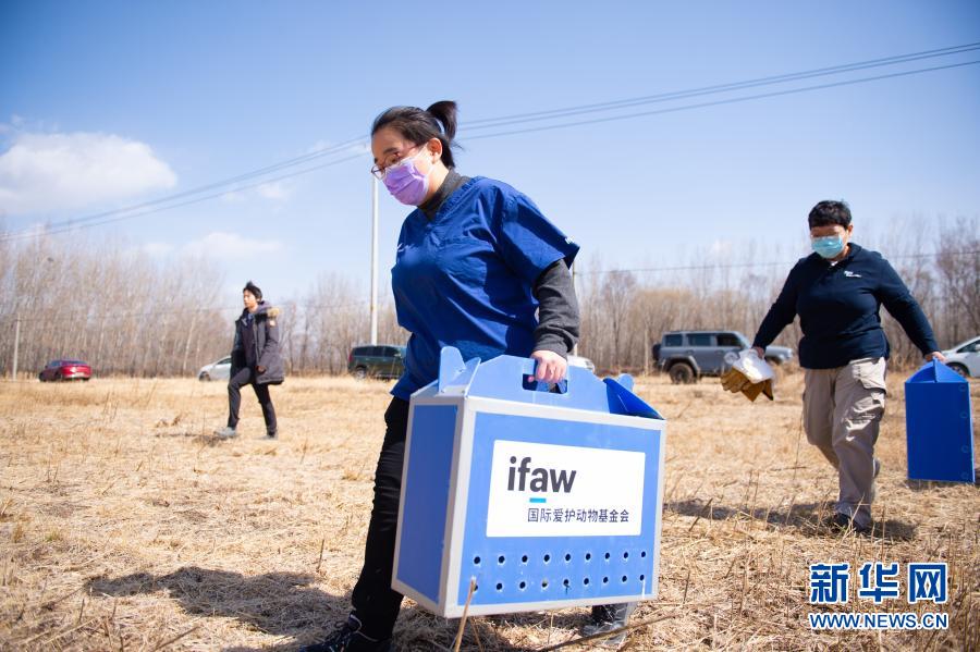 3月20日,北京猛禽救助中心猛禽康復(fù)師戴暢(中)和周蕾(右)將裝有大鵟的猛禽運(yùn)輸箱運(yùn)至放飛場(chǎng)地。