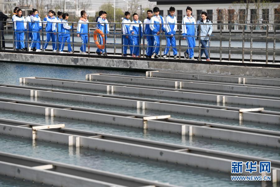 3月21日,水廠工作人員向?qū)W生介紹自來水生產(chǎn)流程。