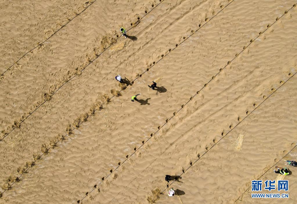 3月28日,人們?cè)谇夷┛h城不遠(yuǎn)處的塔克拉瑪干沙漠內(nèi)植樹(無人機(jī)照片)。