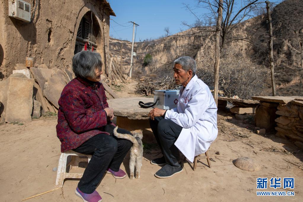 在山西省石樓縣鐵頭村寺山自然村,張尚保(右)在為村民講解健康知識(3月24日攝)。新華社記者 楊晨光 攝