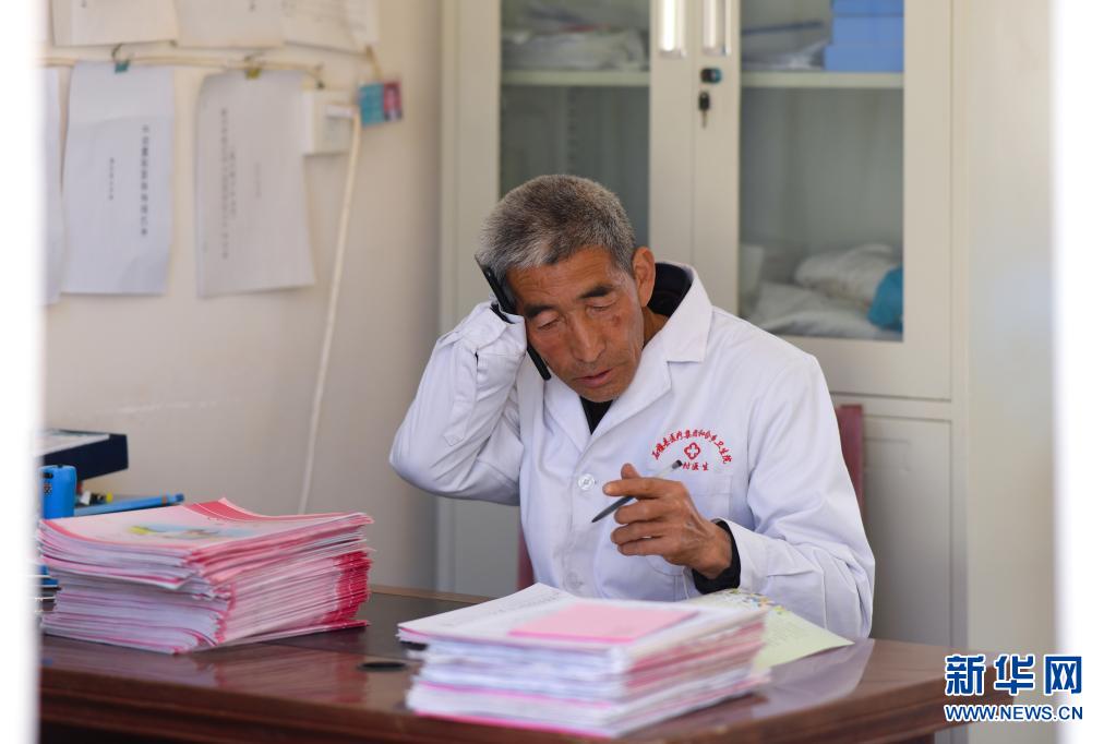 在山西省石樓縣鐵頭村衛(wèi)生室,張尚保在接聽(tīng)詢?cè)\電話(3月24日攝)。新華社發(fā)(劉亮亮 攝)