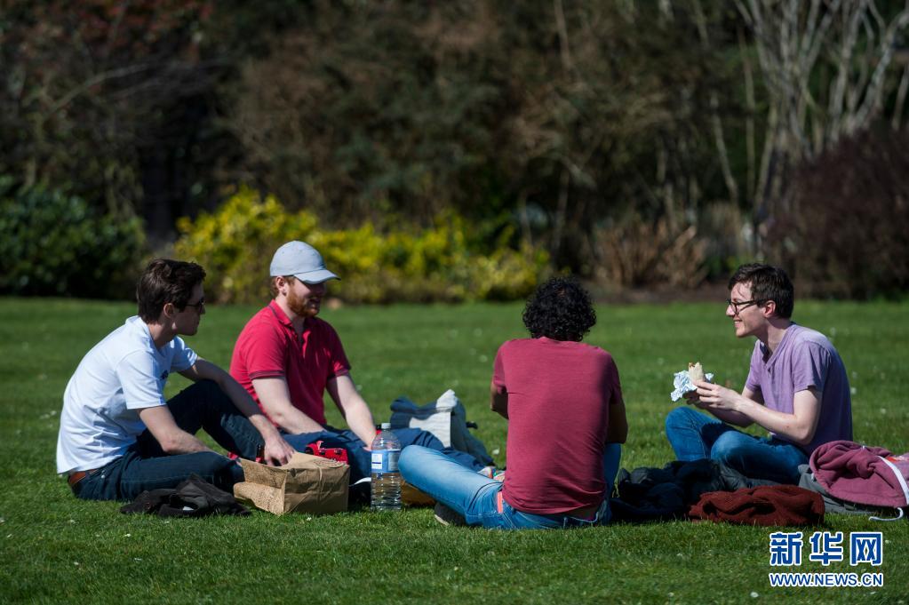 3月29日,人們?cè)谟鴤惗財(cái)z政公園的草地上野餐。