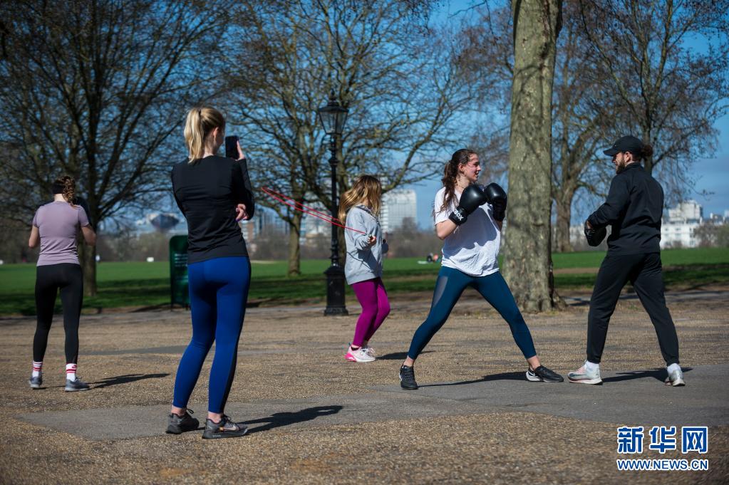 3月29日,人們在英國倫敦海德公園進行戶外拳擊練習(xí)。