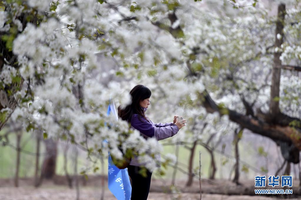 4月3日,游客在中衛(wèi)市南長灘村拍攝盛開的梨花。