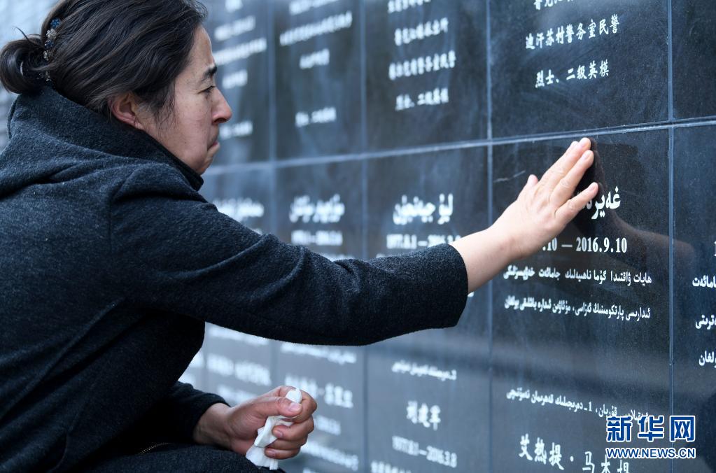 4月3日,在烏魯木齊市革命烈士陵園,瑪依努爾撫摸鐫刻在新疆公安英烈紀(jì)念碑上艾熱提的名字。