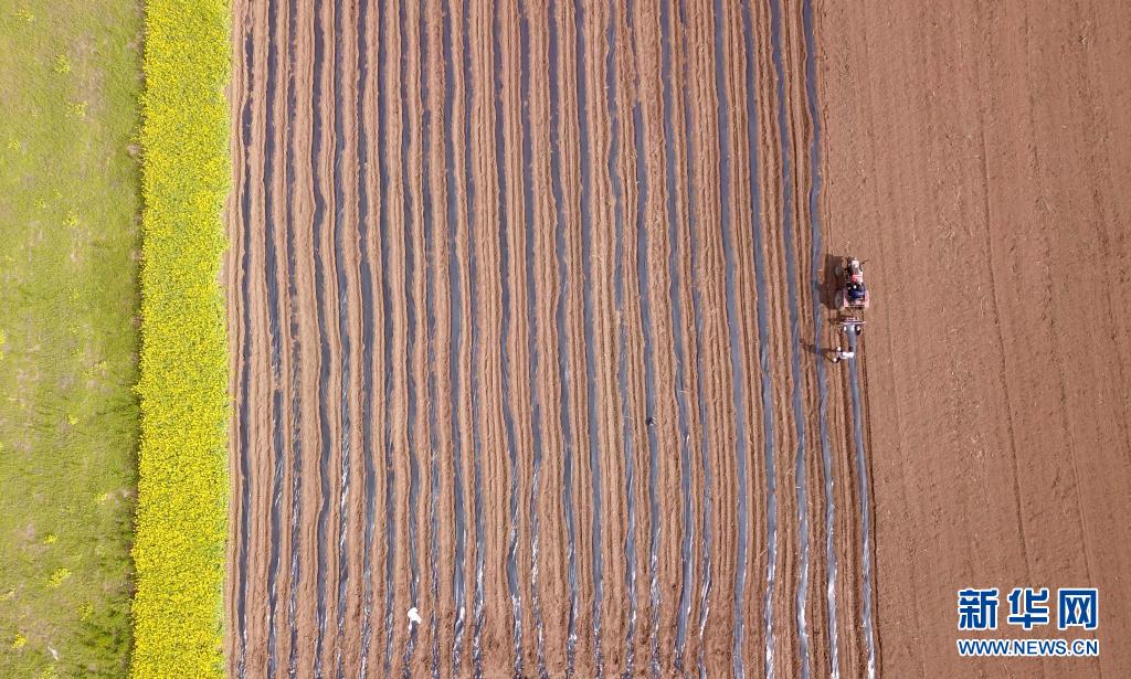 4月6日,在河南省洛陽市汝陽縣蔡店鄉(xiāng)孟腦村,農(nóng)民駕駛拖拉機(jī)在辣椒地里覆蓋地膜,為及時(shí)移栽辣椒做好準(zhǔn)備工作(無人機(jī)照片)。