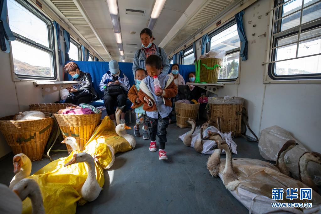 在5633次列車(chē)上,小朋友走過(guò)兩邊放著家禽的車(chē)廂(4月11日攝)。新華社記者 沈伯韓 攝