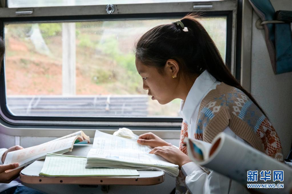 在乘坐5633次列車從家返校途中,一名學(xué)生在復(fù)習(xí)功課(4月11日攝)。新華社記者 沈伯韓 攝