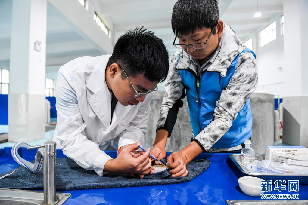 4月20日,大藤峽魚(yú)類增殖放流站的工作人員給符合繁育條件的魚(yú)苗打催產(chǎn)針。