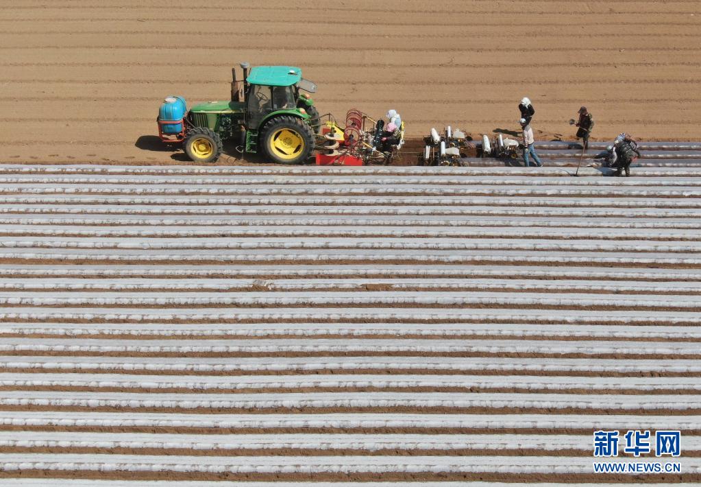 4月20日,工人操作機(jī)械設(shè)備在河北省張家口市塞北管理區(qū)農(nóng)業(yè)基地為剛播種的胡蘿卜覆膜(無(wú)人機(jī)照片)。