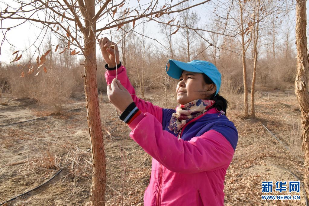 治沙員帕提古麗觀察梭梭林長勢(4月1日攝)。新華社記者 高晗 攝