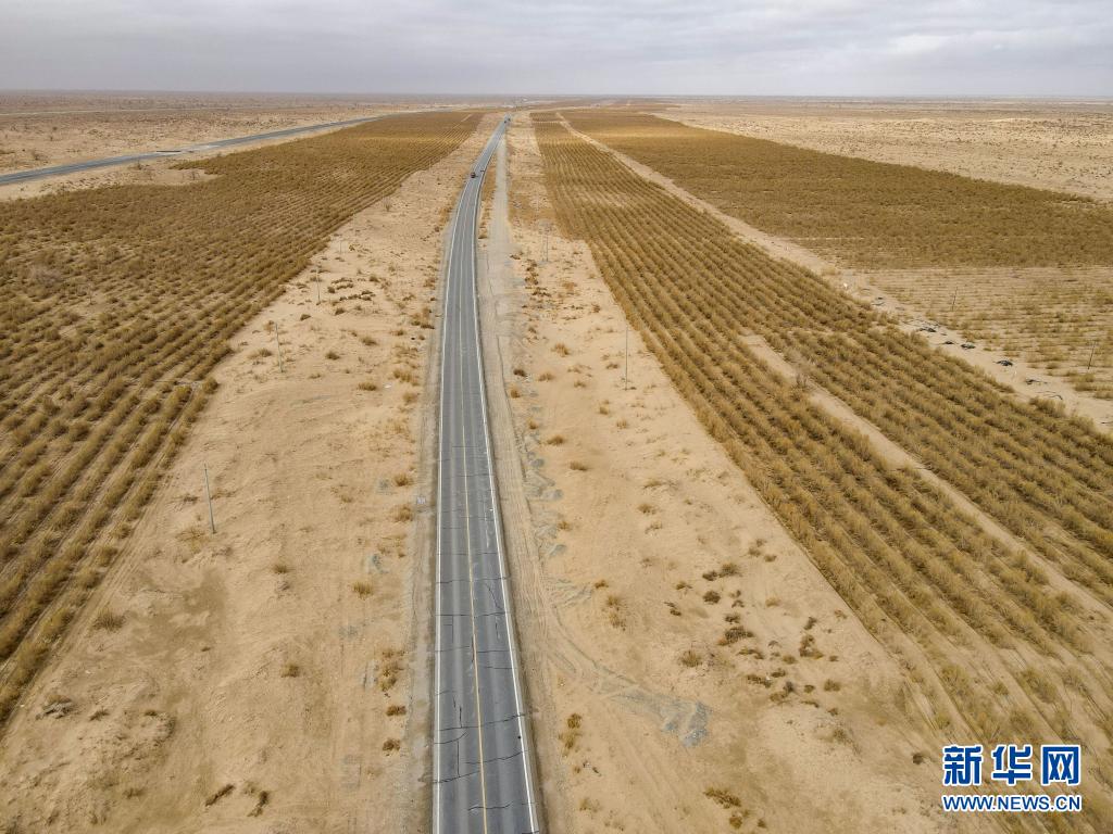 這是且末縣國道旁種植的生態(tài)梭梭林 (3月31日攝,無人機照片)。新華社記者 高晗 攝