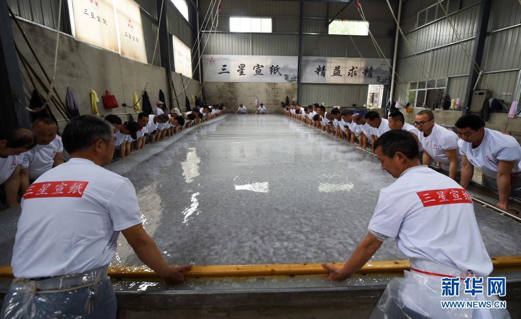 近日,在宣紙產(chǎn)地安徽省宣城市涇縣,“四丈宣紙”的抄制在一家紙業(yè)有限公司啟動(dòng)。50余名撈紙師傅操作巨型紙簾,齊心協(xié)力,在紙槽旁進(jìn)行撈紙作業(yè)。來(lái)回起落兩次,動(dòng)作整齊劃一。隨后工人們將紙簾吊起放至一邊揭下,一張巨大的宣紙便撈制成功。經(jīng)過(guò)曬、剪等工序后, 制成長(zhǎng)13.2米、寬3.6米的巨型宣紙就是“四丈宣紙”。