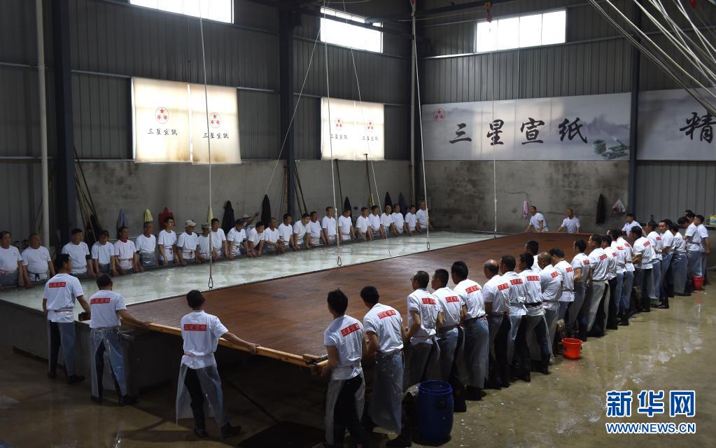近日,在宣紙產(chǎn)地安徽省宣城市涇縣,“四丈宣紙”的抄制在一家紙業(yè)有限公司啟動。50余名撈紙師傅操作巨型紙簾,齊心協(xié)力,在紙槽旁進行撈紙作業(yè)。來回起落兩次,動作整齊劃一。隨后工人們將紙簾吊起放至一邊揭下,一張巨大的宣紙便撈制成功。經(jīng)過曬、剪等工序后, 制成長13.2米、寬3.6米的巨型宣紙就是“四丈宣紙”。